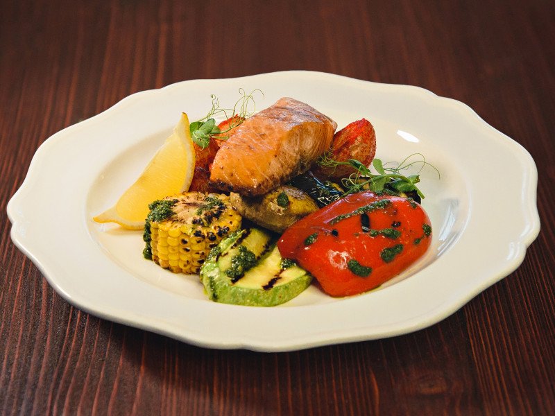 Стейк сёмги, кукуруза початок, кабачок, баклажан, шампиньон, перец болгарский, соус песто, лимон, микрозелень
