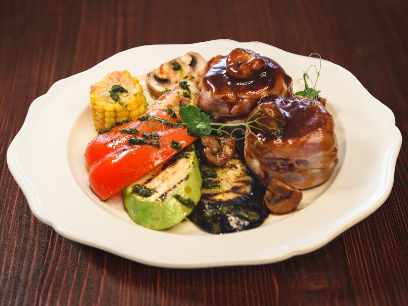 Турнедо из свиной вырезки с беконом с овощами гриль